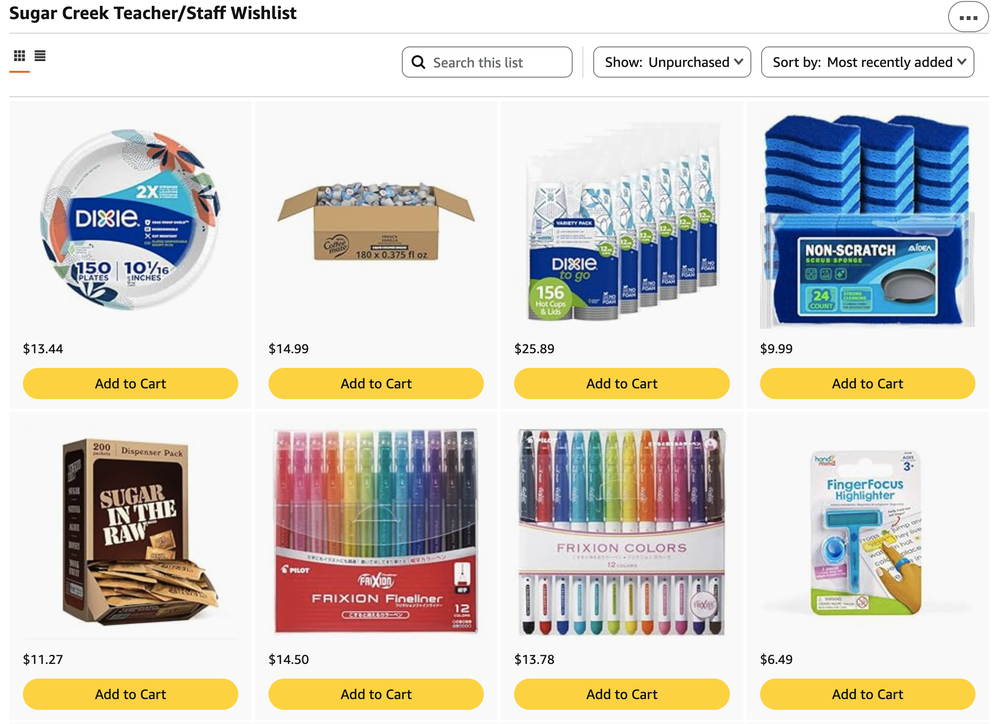 Show your support for Sugar Creek Teacher’s and Staff any time of the year by fullfilling their Amazon Wishlist!